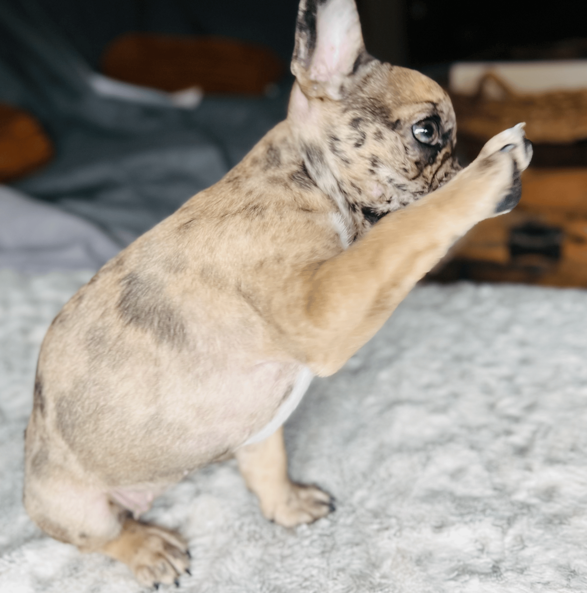 Lulu is a 3-month-old Isabella Merle Frenchie with the softest/sweetest personality. Her favorite toy is a paper towel lol and she LOVES food. Aside from her cheetah-like spots, she has 3 different colored eyes. Her left eye is dark hazel and her right eye is light green with a crystal blue spot in the bottom right edge.