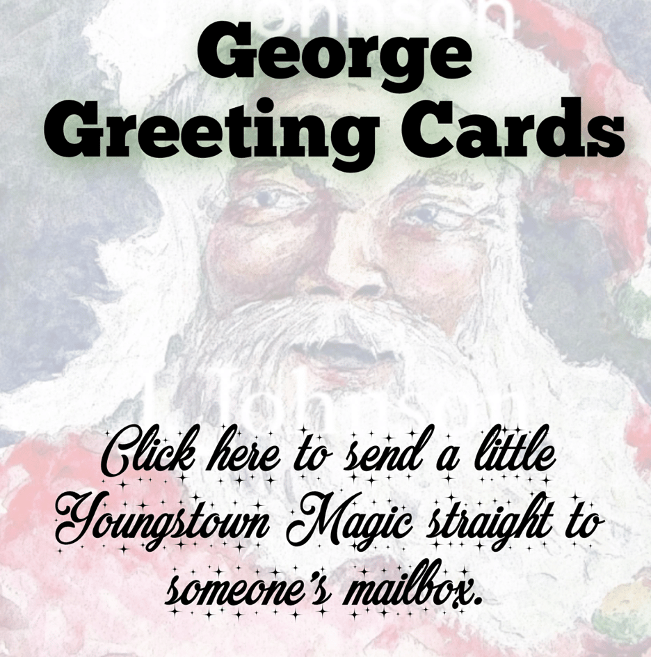 George’s Christmas Cards bring that magic back. Each one features beautiful artwork by Niles local John Johnson — scenes that feel like Christmas morning when you were a kid.