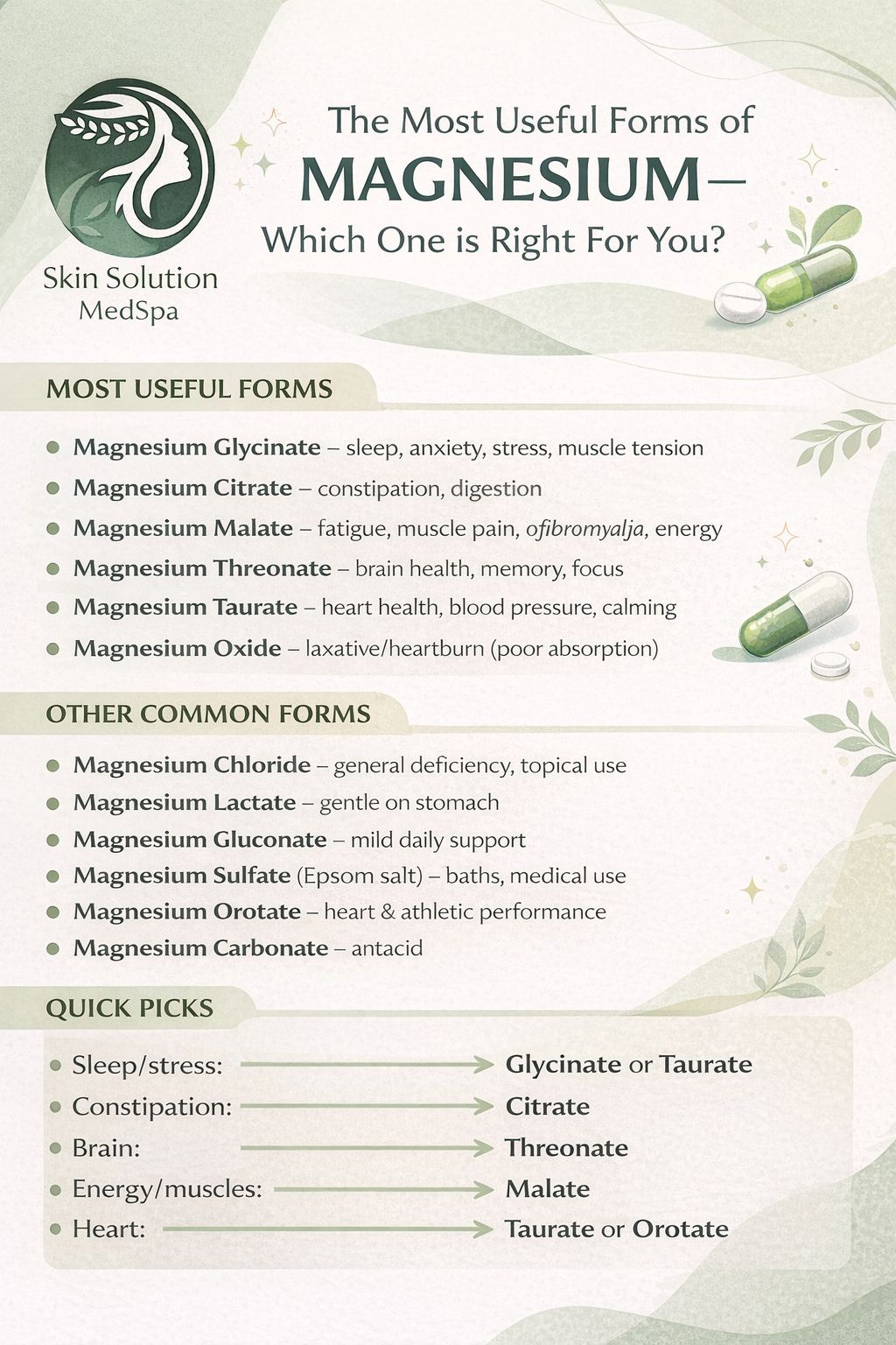 • Magnesium Glycinate – sleep, anxiety, stress, muscle tension (best overall, gentle)